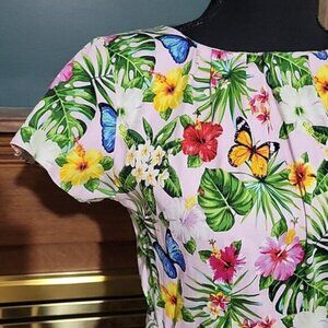 Lady Vintage Dress Butterfly Monstera Leaf Flower Print Cotton Sash Belt Size Sm