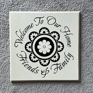 Welcome To Our Home Friends & Family in scripted brown with bohemian medallion in the center