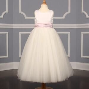 This Ladybug Collection 1040 flower girl dress is so pretty! This dress is made from beautiful, elegant ivory satin and tulle with a pink color sash/bow. The satin is soft to the touch! Your flower girl will easily be able to move around and dance in this dress!