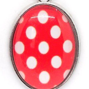 Bright red oval cabochons, 1" long, covered with large white dots are placed into silver-plated oval bezels that create these earrings. The earrings use silver-plated fishhook earwires and are 1.25" long.