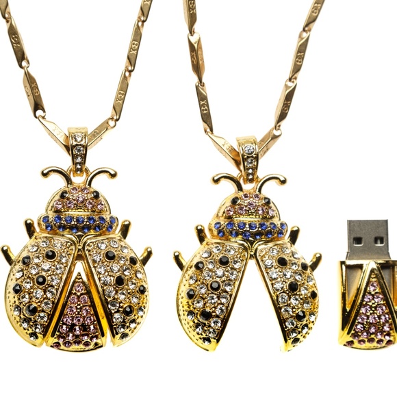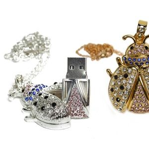8 GB Lady Bug Flash (Pin) Drive. Stainless Steel and Aluminum Paved with Crystals. Can be secured as Necklace or attached to Key Chain.
