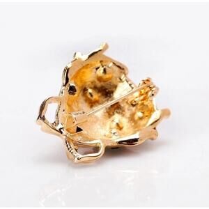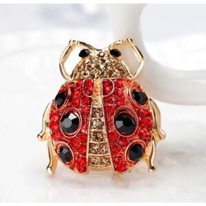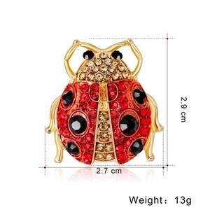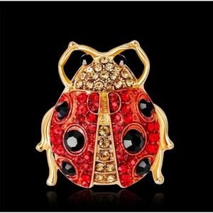 Charming **ladybug pin brooch** in gold tone metal with red enamel, black accents, and sparkling rhinestone crystals. Measures approx. 2.7 cm wide (see photo for exact sizing) and weighs about 13g. A whimsical accessory perfect for adding a pop of fun to jackets, scarves, blouses, or handbags. Secure clasp closure on the back keeps it in place.