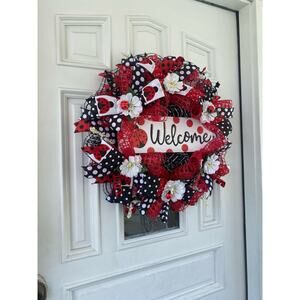 🐞 Brighten your front door with this charming ladybug-themed welcome wreath! Handmade with a stunning mix of red and black deco mesh, polka dot ribbons, white floral accents, and a cheerful “Welcome” sign, this wreath is perfect for spring and summer decorating.