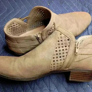 These are ankle boots there suede tan color. Have zippers on one side and buckle on the other. Very stylish! They have a wooden wedge to them also.