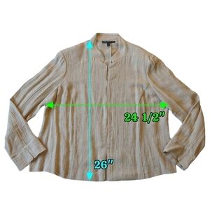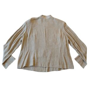 Good used condition, with no stains or tears. An elegant long sleeve lightweight jacket, in a khaki/tan color. Has a stand collar, and removable shoulder pads which are attached via snaps. Can be worn open or closed with the eye+hooks along the front. Versatile for casual or business casual wear. Has an accompanying tank top.