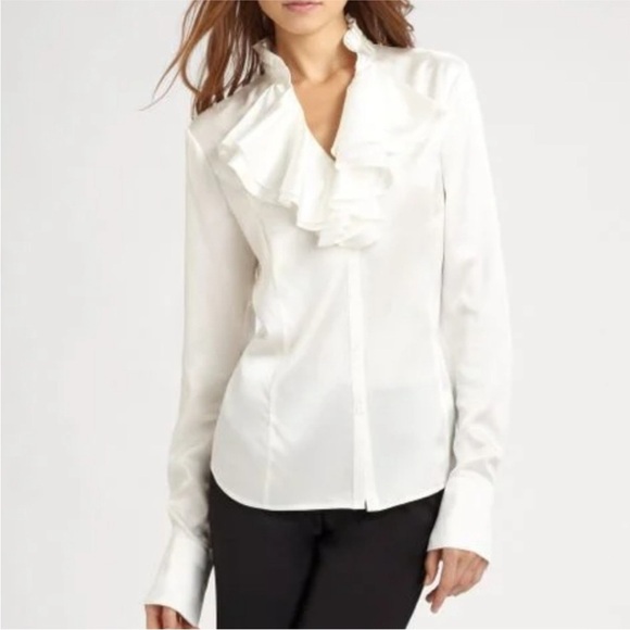 Beautiful Lafayette 148 New York blouse in 100% silk, featuring an elegant ruffle front and a soft cream tone. The silk has a fluid drape and lightweight feel, creating a polished and feminine silhouette.