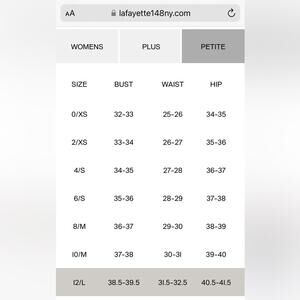 Petite sizing, 12P according to website measurements but please use your own measurements to ensure a good fit as there are no returns.