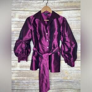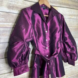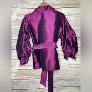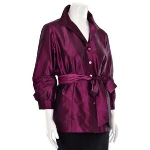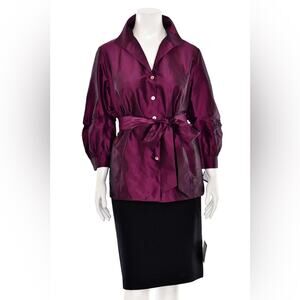 Lafayette 148 2 New York 100% Silk Wrap Blouse in Sugar Plum. This beautiful Lafayette 148 New York blouse is made out of a 100% silk material and comes in a dark purple color / solid pattern. Styling includes a collared v-neck with concealed button front. 3/4 length puffed sleeves with ruched detail and single button cuffs. Optional sash tie at the waist. Truly a gorgeous Lafayette 148 New York blouse! Gently used and guaranteed to make an excellent addition to your career wear wardrobe!