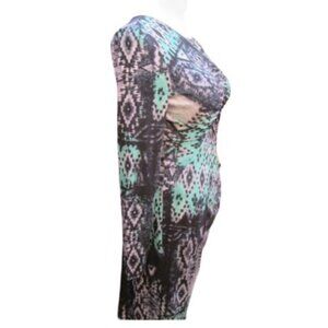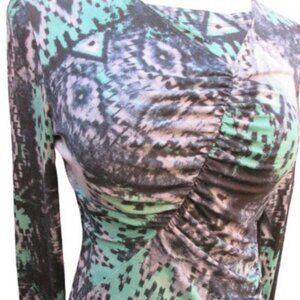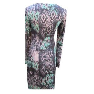 Beautiful Lafayette 148 ruched bodycon dress in a striking purple, blue, and green Aztec-inspired geometric print. The long sleeves and stretch viscose blend create a flattering, comfortable fit that moves with you.