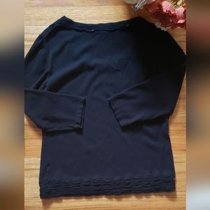Elevate your wardrobe with this chic Lafayette 148 New York black sweater. The 3/4 raglan sleeves and scoop neckline provide a classic look while the rusched collar and hem add unique accents. Made with a tight knit of 67% viscose and 33% polyester, this pullover sweater is lightweight and perfect for both winter and spring occasions.