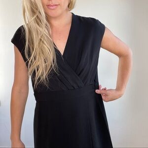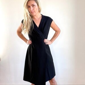 Lafayette 148 Black Surplus Neckline Short Sleeve Dress. Faux wrap Dress. Classic, sophisticated, classy. This is a little black dress you will wear for years.