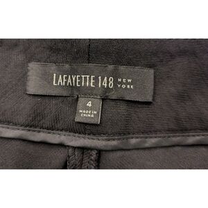 Excellent pre-owned condition. Lafayette 148 Black dress pants. Gold Seam Stripe on outside legs. Viscose and Cotton. Size 4