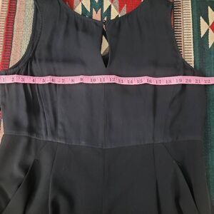 Lafayette 148 Black Wide Leg Scuba Jumpsuit, round neck with button keyhole, Sleeveless, pockets, wide Palazzo legs, back zip closure with draped fabric, relaxed fit, 100% silk top, Polyester polyurethane Blend bottom.