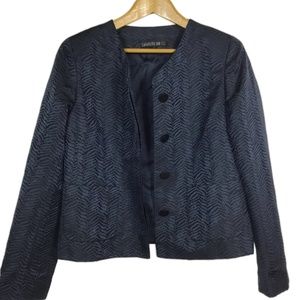 Dark blue textured silk blend crop jacket with round neckline by Lafayette 148 New York. Fully lined with hidden button placket and two pockets in front.