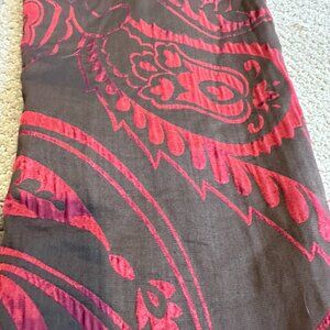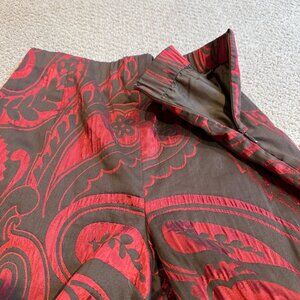 Side zip. Brown with large red embossed paisley print. Elastic waist. Fully lined.