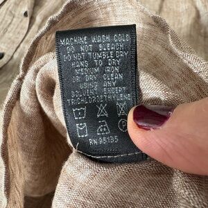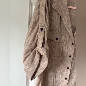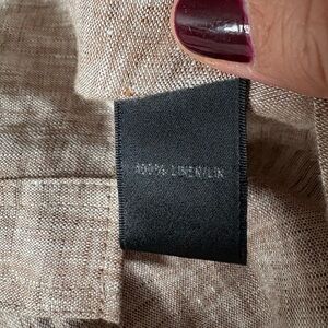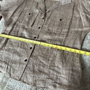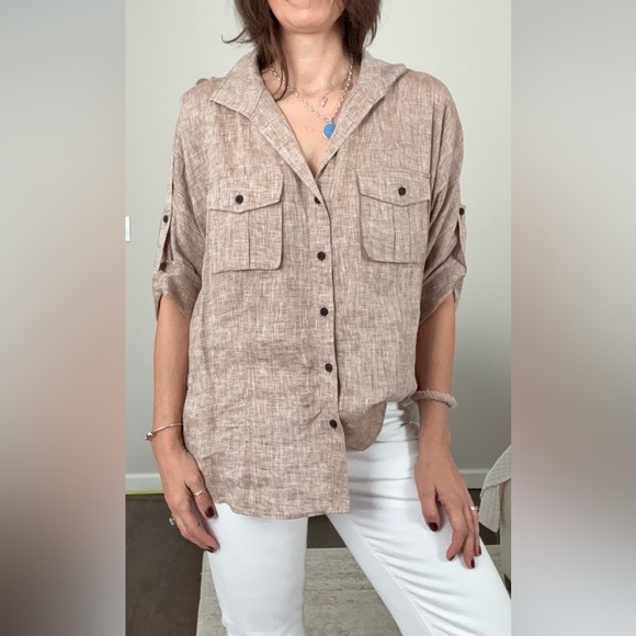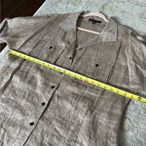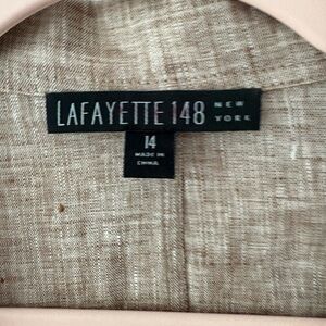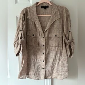 Lafayette 148 Button Up Linen Blouse. Heather Tan color with roll up sleeves that button. Size 14. Measurements in photos. Very good condition.