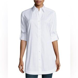 Lafayette 148 white long sleeve button down stretch cotton Jaycee career tunic length top. Long sleeves with a convertible roll tab, two wide front pockets, button front, collared shirt, Stretch cotton poplin blend, relaxed easy fit, curved hem. Casual or Formal, Professional Blouse.