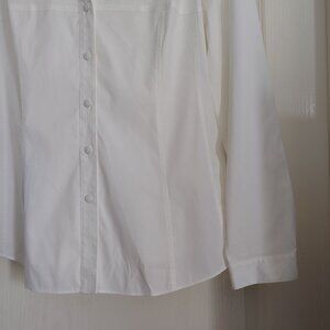 This white long-sleeve shirt is a classic button-down style, likely made from a crisp cotton or cotton-blend poplin fabric, designed with a fitted or tailored silhouette to flatter the body.