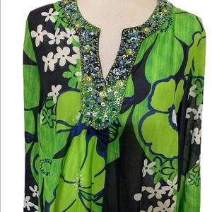 Beautiful green and blue mod oversize flower print beaded tunic by Lafayette 148.