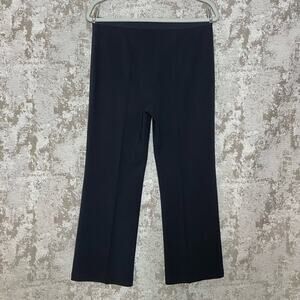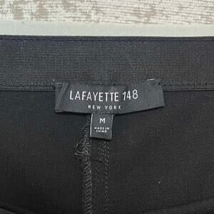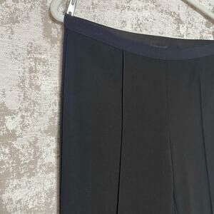 Fabulous trousers from Lafayette 148! Features high rise waist, pull on, stretch waist, grosgrain waist detail, black ponte knit fabric throughout, wide leg style named "Houston", ankle length inseam, and crease seam detail down the center front and back of each leg.
