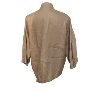 Barely worn. Generous /oversized. Kimono type style/fit. Size is marked as P/S. I am honestly not sure if that means it is a petite small ? Because it appears to be average length to me. Nothing about this appears petite. But that could also be because of its oversized style. 100% linen. Stunning.