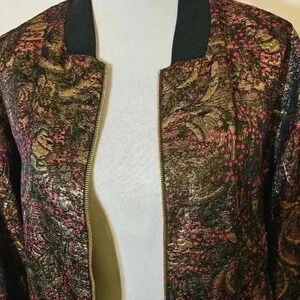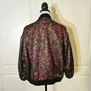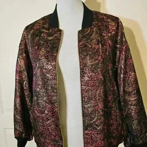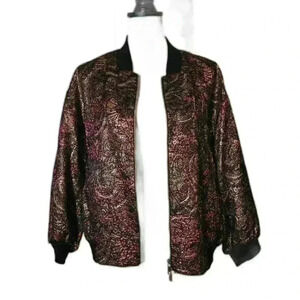 Step out in style with this stunning metallic floral bomber jacket. This eye-catching piece features intricate gold and pink floral patterns on a sleek black background, making it perfect for both casual outings and dressier occasions. The lightweight, breathable fabric ensures comfort, while the ribbed cuffs and hem provide a snug fit. Ideal for layering, this jacket can enhance any outfit, adding a touch of glamour to your wardrobe. Don't miss the chance to make a statement with this unique fashion item!