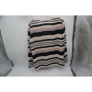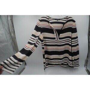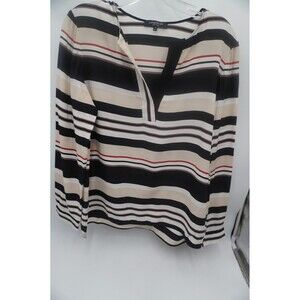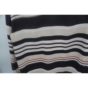 Pre-owned without tags Lafayette 148 New York 100% Silk V Neck Stripe Tunic Long Sleeve Multi Color Size M. Elevate your wardrobe with this authentic Lafayette 148 New York tunic blouse. This stylish and versatile piece features a multi-color striped pattern with black, beige, and red stripes, a v-neckline, and long sleeves. Made from a lightweight, breathable, and luxurious silk blend, it's perfect for transitioning from a professional work setting to a casual evening out. This designer top is a timeless addition to any collection, offering both elegance and comfort.