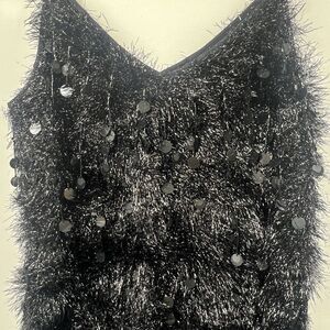 -Tank top with fringe, beads and sequins. Fringe is super soft with stretch