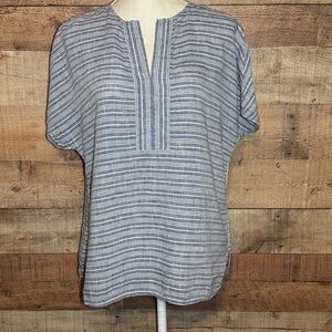 Lafayette 148 NY striped, linen blend, chambray blue and white stripe top blouse shirt size Medium. Pre-loved condition. Split V-neckline and white piping detail on side hem.