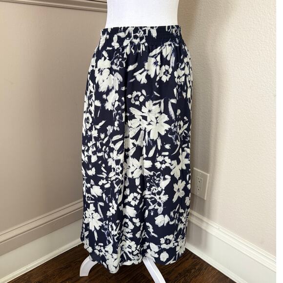Lafayette 148 New York navy and white floral print midi skirt in soft viscose, size Medium. Features a wide pull‑on waistband, full lined skirt, and easy drape for a polished yet comfortable silhouette. Perfect for work, travel, or dressed‑up casual outfits with a tee or blouse.