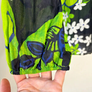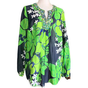 Lafayette 148 Neon Green Blue Mod Floral Print Beaded Neck Tunic Top Size 10