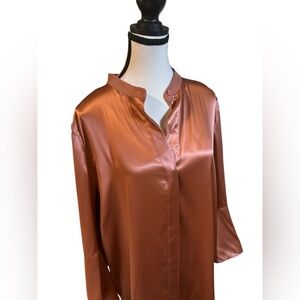 This stylish blouse from Lafayette 148 New York showcases a stunning copper silk an oversized fit with a chic mandarin collar and gorgeous fluttery bell sleeve. The vibrant lovely copper hue adds a pop of color, making it a standout piece for any occasion. It does have hidden buttons in the front. It’s so beautiful.