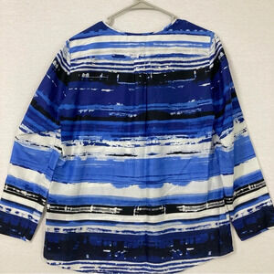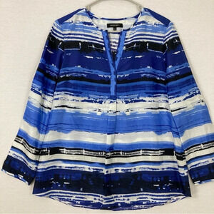 Lafayette 148 New York Blue Black Striped Y Neck 100% Silk Popover Top size 6
