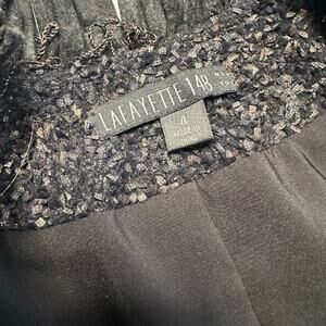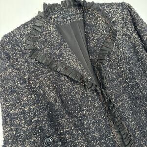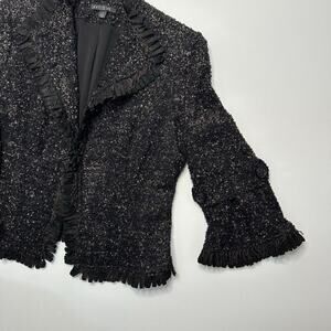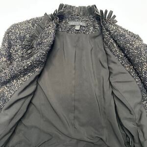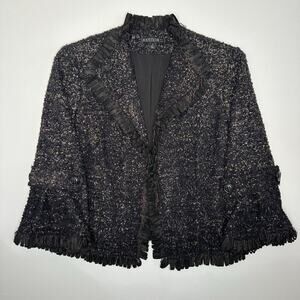 Lafayette 148 New York Boucle Nubby Fringe Short Blazer Jacket. Black body with brown nubs. Edge fringe is black loops with brown threads. Fully lined. One small hook on center front. Flared sleeve with decorative tab. Sleeves are slightly cropped length. Wool/polyamide/elastane blend. Women’s size 4. Good used condition.