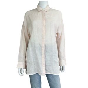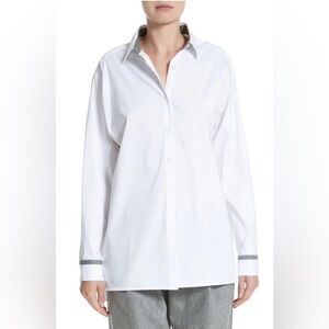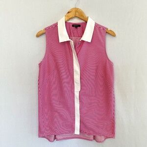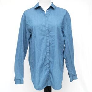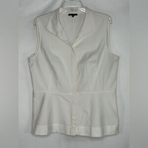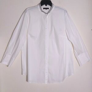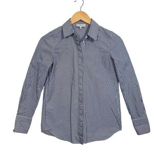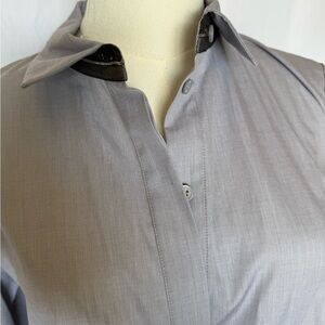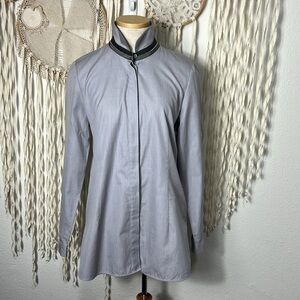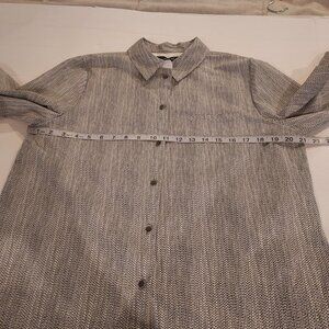 Size large Lafayette 148 New York Chevron Print 3/4 Sleeve Button Front Blouse. 98% cotton 2% elastane. Gray and white chevron print. 3/4 sleeves with white contrast cuffs. Collared neckline. Button front closure. One chest pocket. Pit to pit 21”. Length 29”. Brand new and never worn. Excellent condition.
