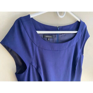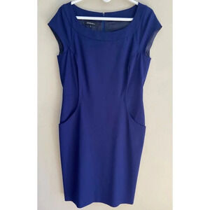 Midnight/Cobalt Blue sheath dress featuring cap sleeves, front side pockets, wide/boat neck, rear zip, rear slit and lining. Approximately knee length. Fitted.