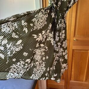 NWOT beautiful Lafayette 148 dress, never worn. Olive green fabric with abstract floral design has a translucent fabric and light lining.