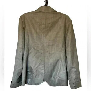 Elegant gray blazer with pinstripe design. Single button closure. Perfect for professional settings.