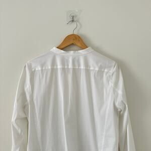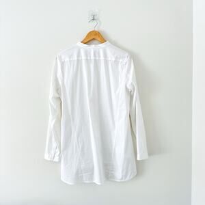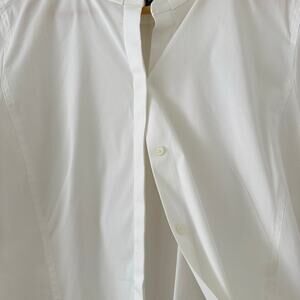 Details: Lafayette 148 New York Long Sleeve High Low Hem Button Up Shirt- Size: 10- Color: White- Material: 72% Cotton, 23% Polyamide, 5% Lycra- Features: Long sleeve, high low hem, button closure, machine wash, mandarin collar, lightweight, comfort, breathable, casual.