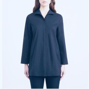 An exquisite stretch-cotton blend from Italy refines a tunic-length blouse in an effortless A-line silhouette with a vented high/low hem.