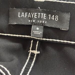 Lightweight black cropped pants with white contrast stitching. Belt loops and five pocket styling. Zip fly. These black crop leg pants from Lafayette 148 New York have a white topstitching. Crafted for a sleek and modern look, they offer a clean silhouette perfect for any occasion. Stylish cropped polyester/polyurethane mid rise black straight leg pants. Perfect for casual or formal wear. Gently worn