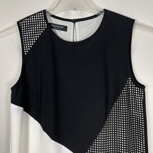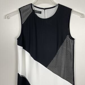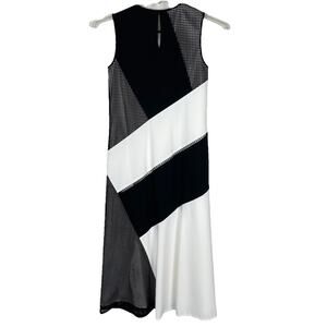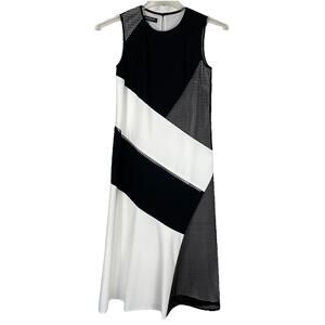 This Lafayette 148 New York Midi Dress in size Small is a stylish and versatile option for a variety of occasions. This black and white color-blocked dress features a sleeveless design with a round neckline and zip closure. The laser-cut details add a unique touch to the A-line silhouette, making it suitable for travel, weddings, parties, and more. Made from a blend of polyester and acetate jersey fabric, this dress is lightweight, stretchy, and slimming, perfect for year-round wear.