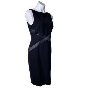 Elegant sheath dress featuring a sleek black design with leather crisscross accents. Ideal for formal occasions or professional settings, offering timeless sophistication.