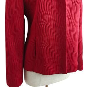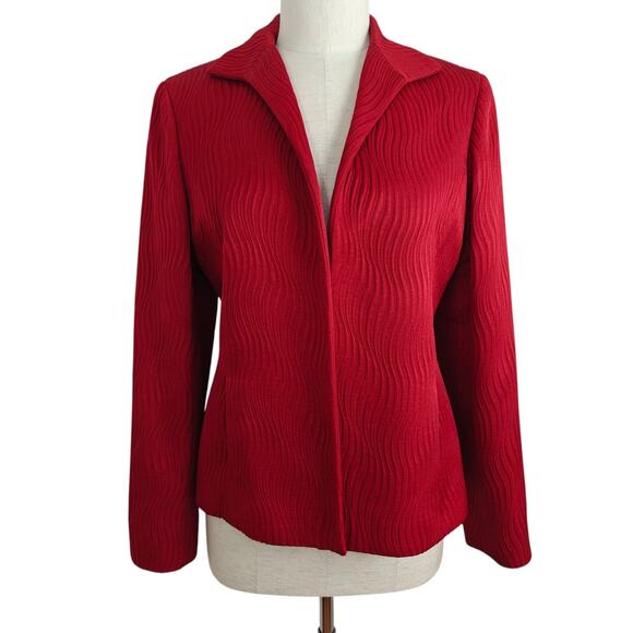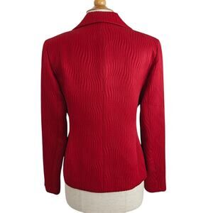 Lafayette 148 New York open front blazer jacket in women's size 8. Red textured cotton/silk blend fabric. Fully lined in black. Front pockets. Long sleeves. Made in New York City. Gently pre-owned.