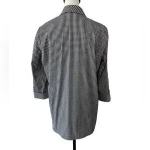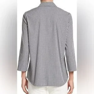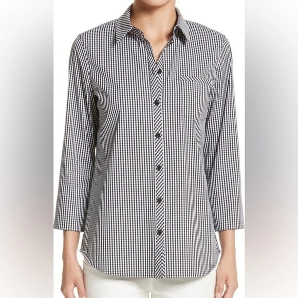 Lafayette 148 New York, Gingham Shirt, Designer Blouse, 3/4 Sleeves, Office wear, Minimalist, Stretch Cotton, Black and White Check