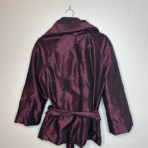 Lafayette 148 New York purple silk wrap jacket with tie waist. Luxurious iridescent silk in dramatic plum - sophisticated statement piece with kimono-inspired sleeves.