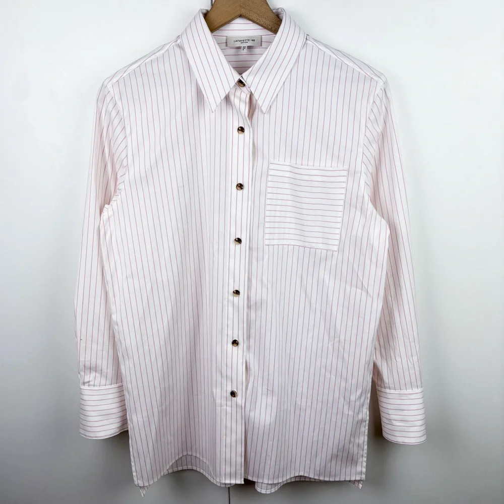 Lafayette 148 New York Striped Button Down Cotton Shirt in white pink striped poplin 100% cotton material. Oversized fit with one breast pocket. Professional career business office corporate wear.
