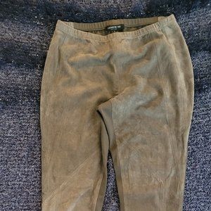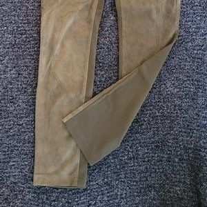 Suede-front Lafayette 148 New York leggings in a beautiful olive color. Size Small. Inseam is 30 inches and elastic waist is about 28 inches. Mid-rise. Made with buttery-soft Italian lambskin suede in front and stretchy viscose blend knit fabric in back. Professionally clean only by leather, suede or fur expert. Pre-owned.