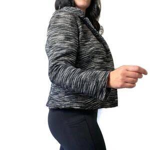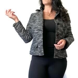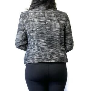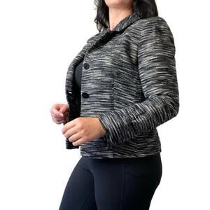 Great used condition! Textured black and white tweed blazer. Three button front with faux flap pockets. Split hem cuffs and a notched blazer. Fully lined with darted seams in front and back. No size tag but fits like an 8.