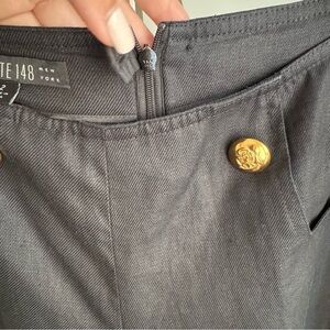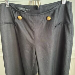 Elegant wide leg black 100% linen pants by Lafayette 148 New York. Features striking gold buttons on front and faux pockets. Long and relaxed fit. Back zip closure.